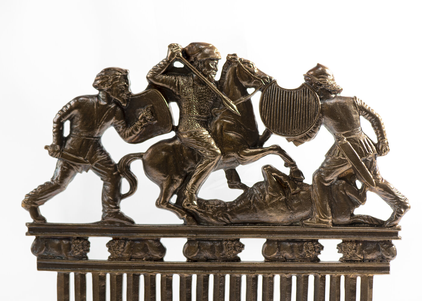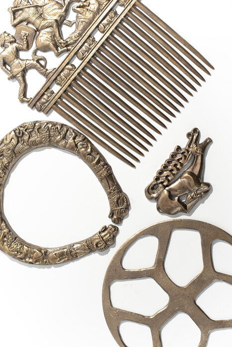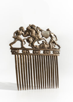 Пектораль - внешний диаметр 180 мм, внутренний 135 мм. Гребень - 250х210 мм. Бляха - 100х70 мм. Амулет - диаметр 200 мм